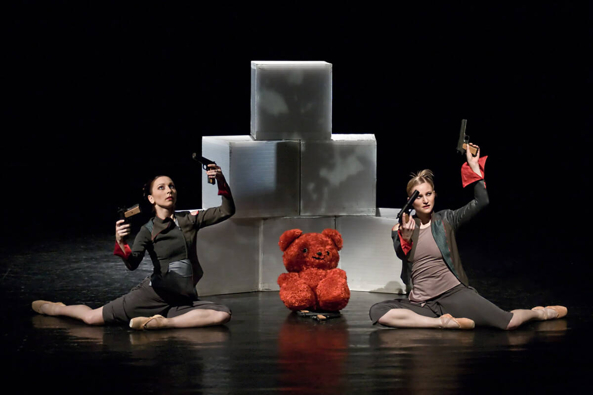 Petr Zuska tu specifickým způsobem rozvíjí formu koláže, která je sama o sobě principem zdánlivé konfrontace. Spojuje jednorozměrné podobenství lidské agresivity s téměř klipovitě současnými obrazy. Uctívání plyšového medvídka, hra s pistolemi, to jsou jen zástupné znaky pro jevištní metaforu nenávratně mizejícího dětství a s ním i věku jistot, nevinnosti a čistoty. Zuska se v tomto díle vyrovnává do jisté míry s popkulturou, chvíli s nadhledem, občas s jemným úšklebkem i pochopením.