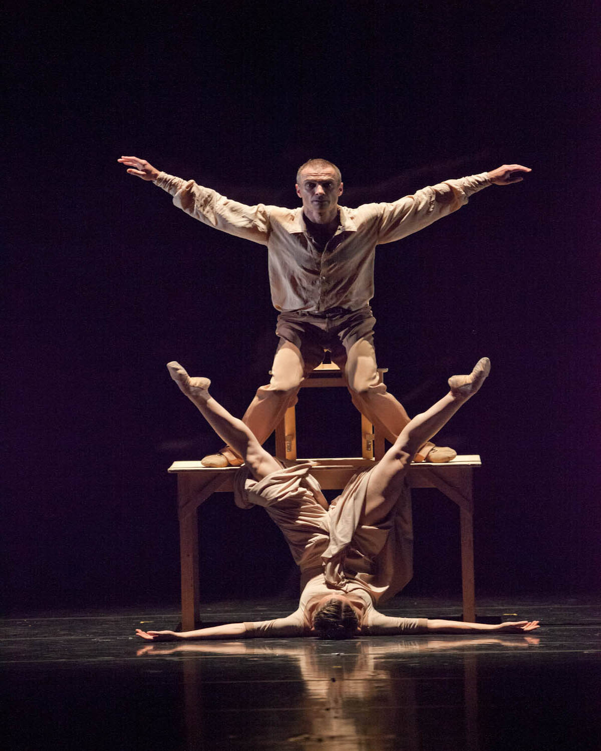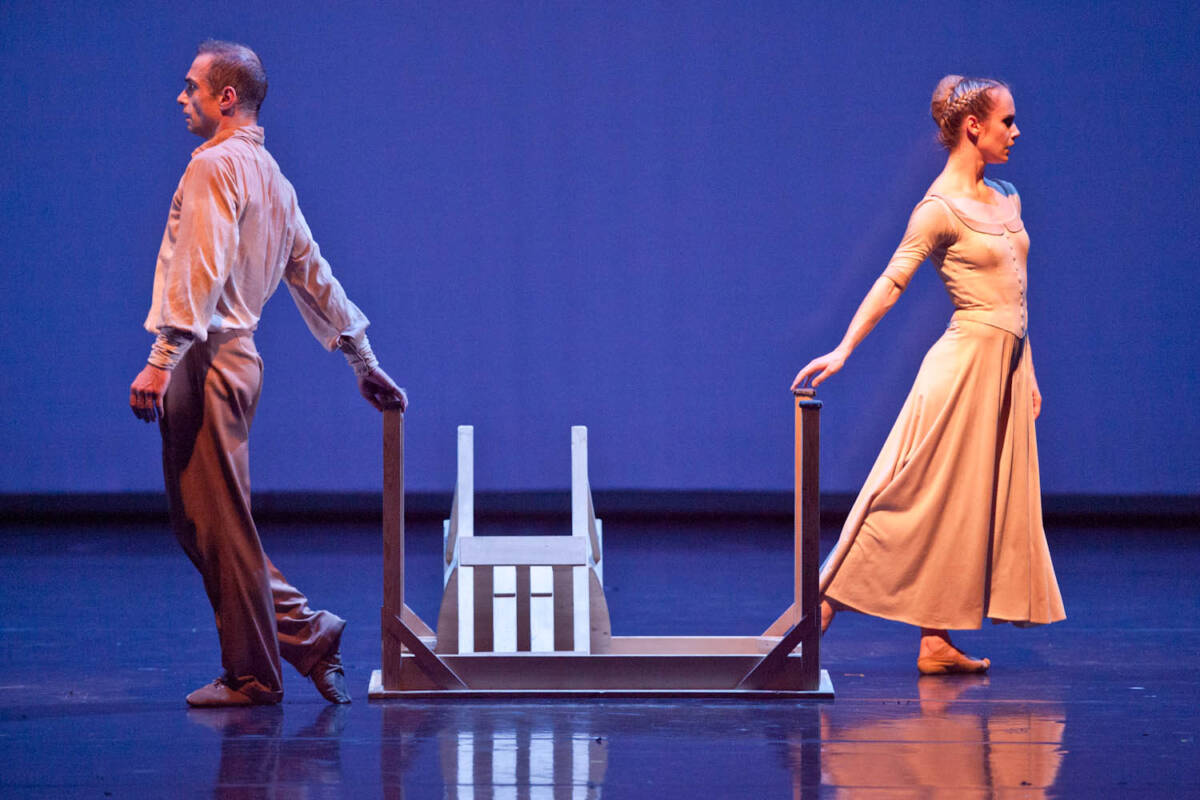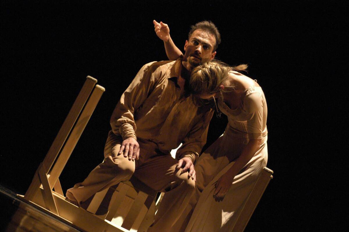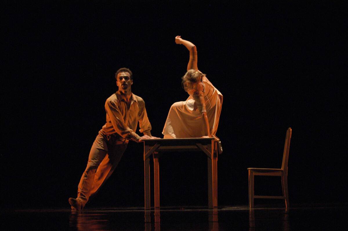Les bras de mer (The Arms of the Sea – a sea bay) is a duet, or a quartet, for a woman, man, table and chair. It is a parable of a relationship between two persons, leading a gentle dialogue and immersed in tense silence, their permeation and passing by. A relationship full of departures and returns to the circle of expectations, as well as questions as to who is the person next to me and who am I…