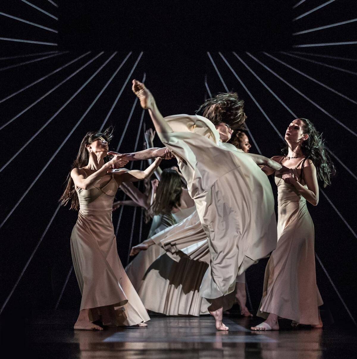 The extremely dynamic composition is an entanglement of movement loops, whose motives keep reoccurring, propagating, superimposing, intensifying. It centres on a single subject – the irrepressible grief of a mother. Permutations of and variations on the movement of identical women, along with the totally empty stage, come across as minimalistic even. They actually resemble the spectacular minimalism and repetitiveness of the classical ballet blanc style.