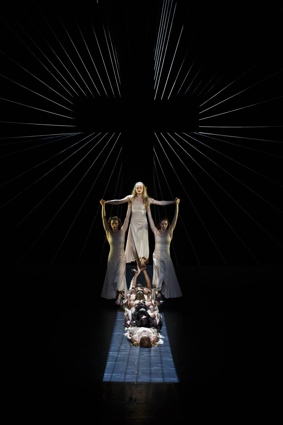 Treating the motif of death, the piece harbours magnificent, ritual music, works with female bodies and expressiveness, the female archetype refined by tradition – a young long-haired woman clad in a long white dress, with her arms bare and breasts impressed in satin. Women multiply like sisters, flooding the stage, on to which they fall, strenuously and painfully, from the opening in the foot of a large cross that dominates the backdrop.